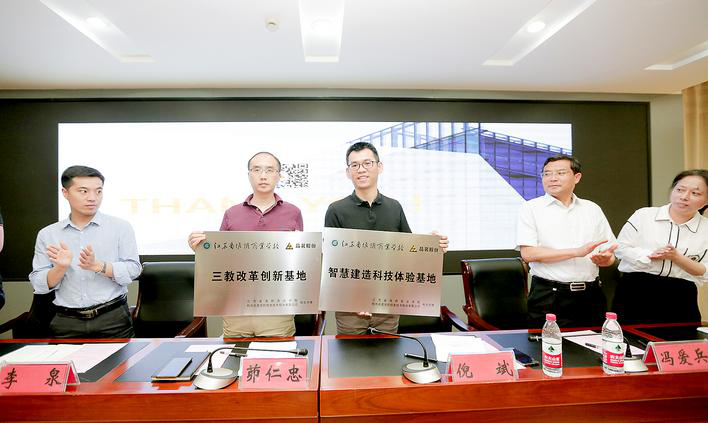 仪式上,校企双方签订了战略合作协议,并为智慧建造科技体验基地和三教改革创新基地揭牌。
