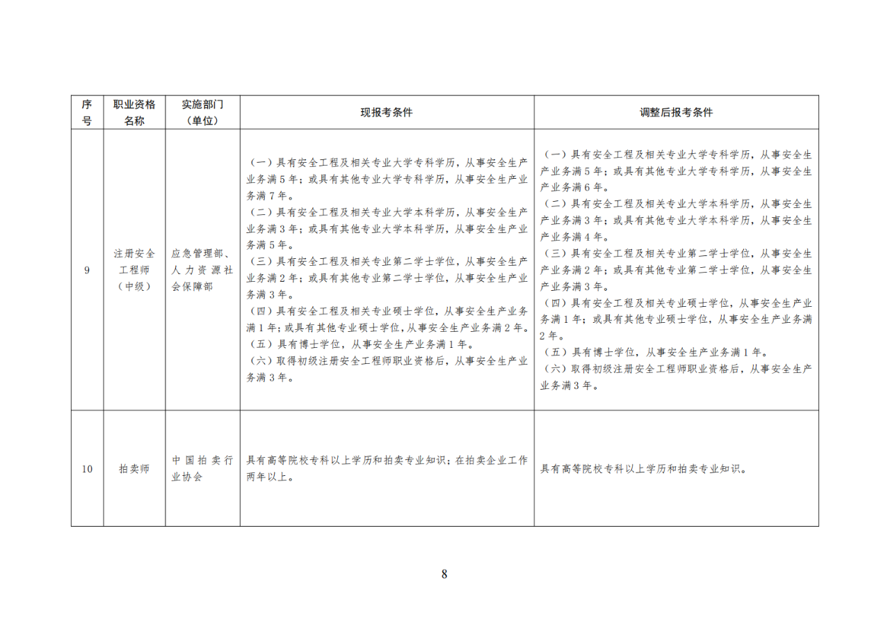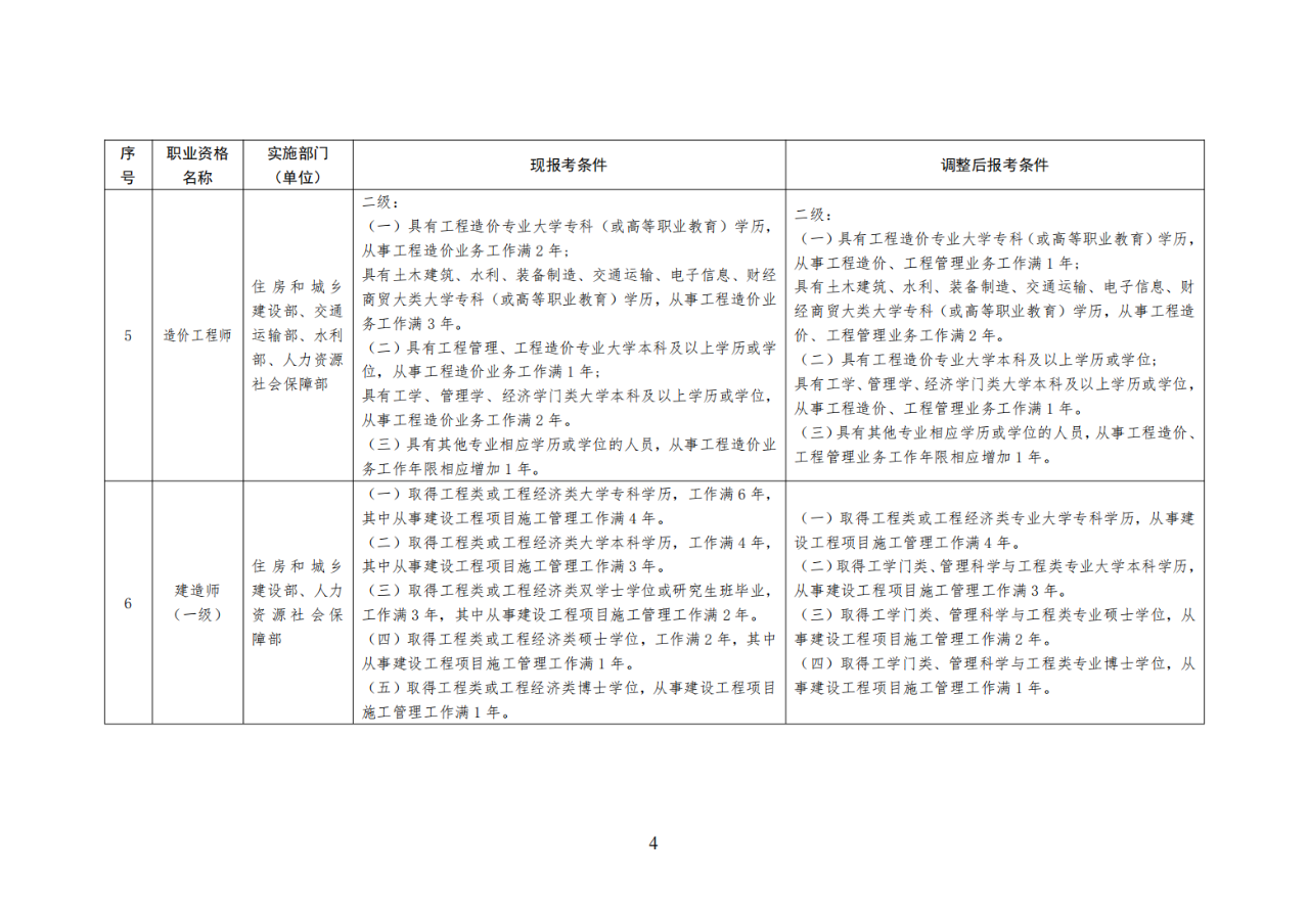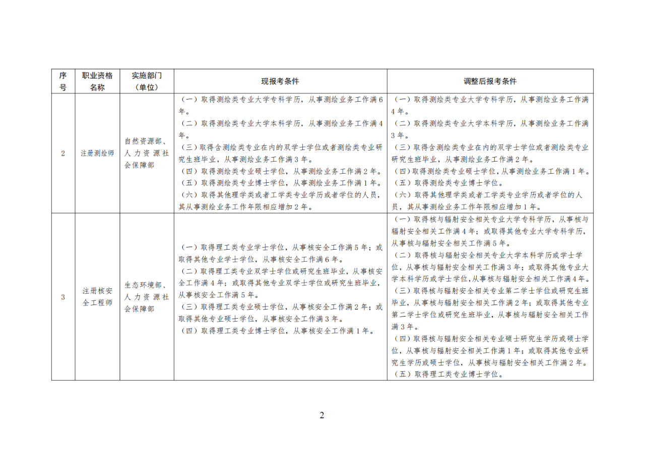 根据国务院推进简政放权、放管结合、优化服务的改革部署,为贯彻落实《政府工作报告》要求,进一步推动降低就业创业门槛,经国务院同意,降低或取消《国家职业资格目录(2021年版)》中13项准入类职业资格考试工作年限要求。现就有关事项通知如下。一、《部分准入类职业资格考试工作年限要求调整方案》(见附件)自2022年起实施。除调整考试工作年限要求外,13项准入类职业资格的其他考试报名条件不变。二、各有关部门要按照本通知要求,抓紧修订相关部门规章,及时调整考试办法,做好政策宣传和舆论引导,让广大专业技术人员充分了解政策,确保政策落地落实。三、各地区、各有关部门要积极推行考试报名证明事项告知承诺制,依托全国一体化政务服务平台、国家数据共享交换平台,通过政府部门内部核查等方式对报考人员填报的信息进行核验,压减报考人员需提交的书面材料,进一步优化考试报名服务,减轻专业技术人员负担。四、考试工作年限要求调整后,专业技术人员取得的职业资格可继续按照有关规定与相应系列和层级的职称对应,并可作为申报高一级职称的条件。五、各地区、各有关部门要加强职业资格领域事前事中事后全链条全领域监管,严格制定考试大纲,认真履行命审题职责,在考试中加强对实际工作能力的考察力度,严厉打击考试违纪行为,强化对取得职业资格人员的专业能力评估和继续教育,确保政策落地后职业资格水平不降低。 附件:部分准入类职业资格考试工作年限要求调整方案