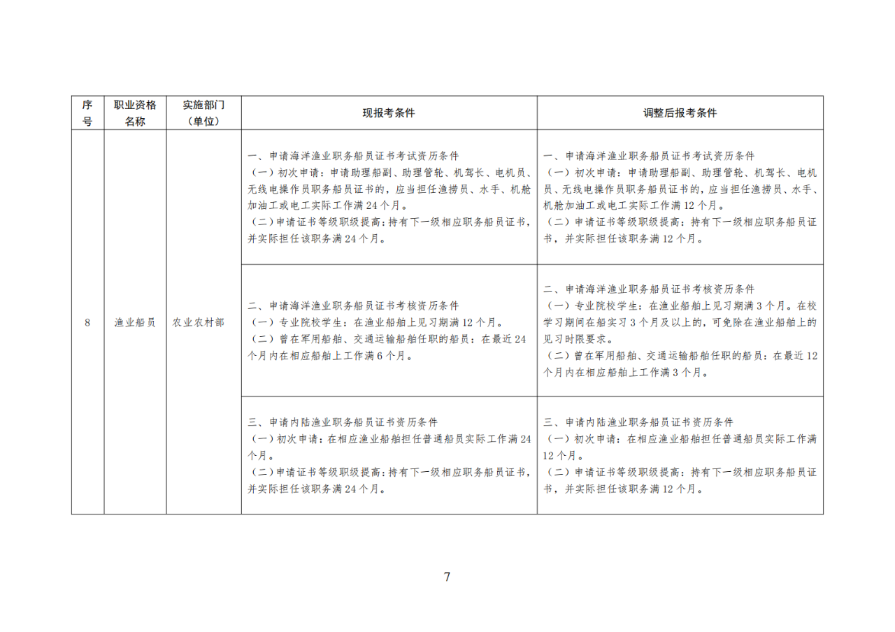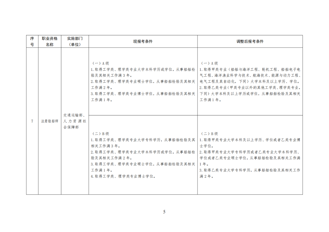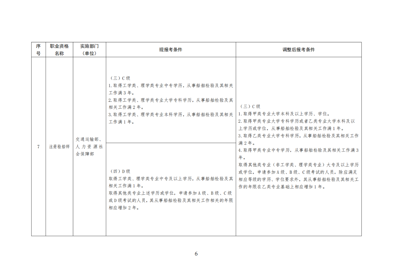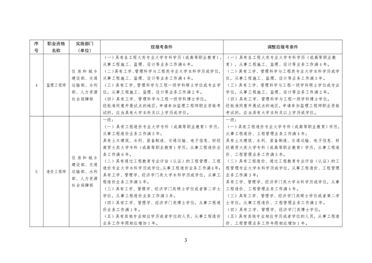 根据国务院推进简政放权、放管结合、优化服务的改革部署,为贯彻落实《政府工作报告》要求,进一步推动降低就业创业门槛,经国务院同意,降低或取消《国家职业资格目录(2021年版)》中13项准入类职业资格考试工作年限要求。现就有关事项通知如下。一、《部分准入类职业资格考试工作年限要求调整方案》(见附件)自2022年起实施。除调整考试工作年限要求外,13项准入类职业资格的其他考试报名条件不变。二、各有关部门要按照本通知要求,抓紧修订相关部门规章,及时调整考试办法,做好政策宣传和舆论引导,让广大专业技术人员充分了解政策,确保政策落地落实。三、各地区、各有关部门要积极推行考试报名证明事项告知承诺制,依托全国一体化政务服务平台、国家数据共享交换平台,通过政府部门内部核查等方式对报考人员填报的信息进行核验,压减报考人员需提交的书面材料,进一步优化考试报名服务,减轻专业技术人员负担。四、考试工作年限要求调整后,专业技术人员取得的职业资格可继续按照有关规定与相应系列和层级的职称对应,并可作为申报高一级职称的条件。五、各地区、各有关部门要加强职业资格领域事前事中事后全链条全领域监管,严格制定考试大纲,认真履行命审题职责,在考试中加强对实际工作能力的考察力度,严厉打击考试违纪行为,强化对取得职业资格人员的专业能力评估和继续教育,确保政策落地后职业资格水平不降低。 附件:部分准入类职业资格考试工作年限要求调整方案