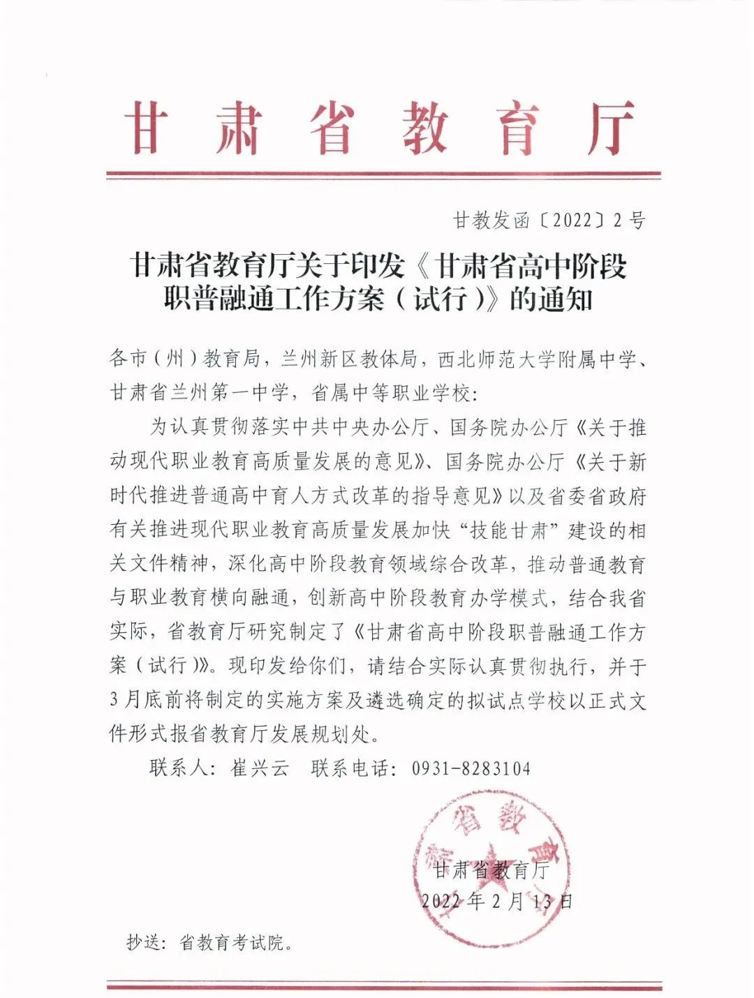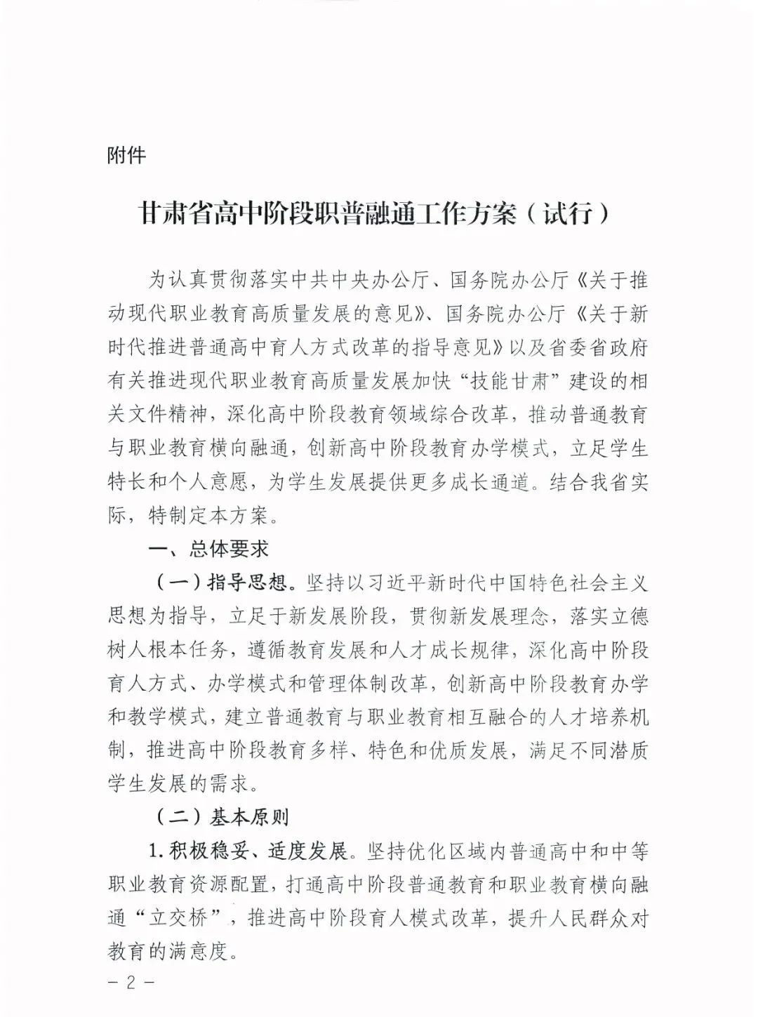甘肃省教育厅关于印发《甘肃省高中阶段职普融通工作方案(试行)》的通知
