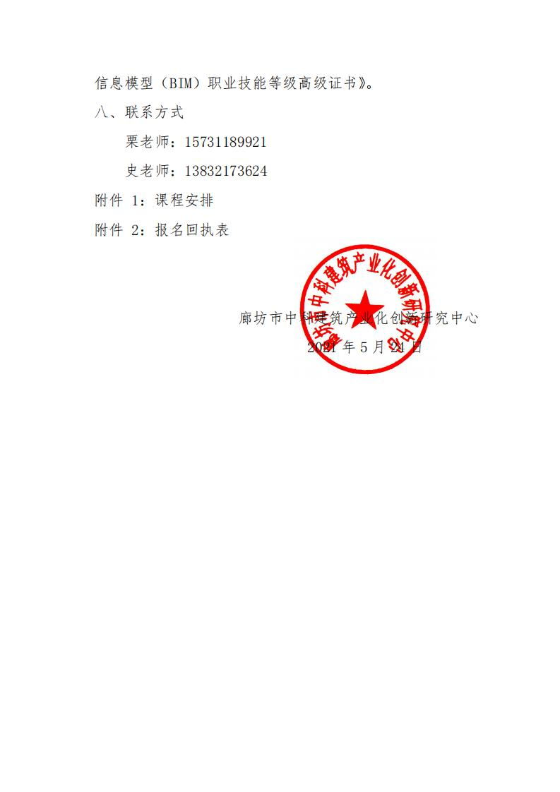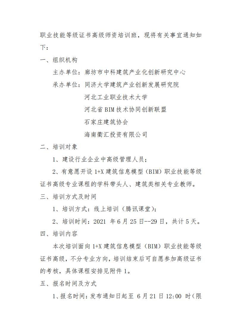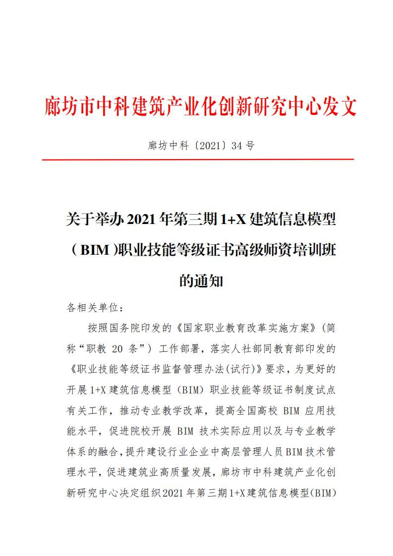 廊坊中科[2021]034号-关于举办2021年第三期1+X建筑信息模型(BIM)职业技能等级证书高级师资培训班的通知.pdf