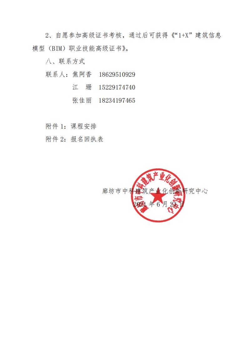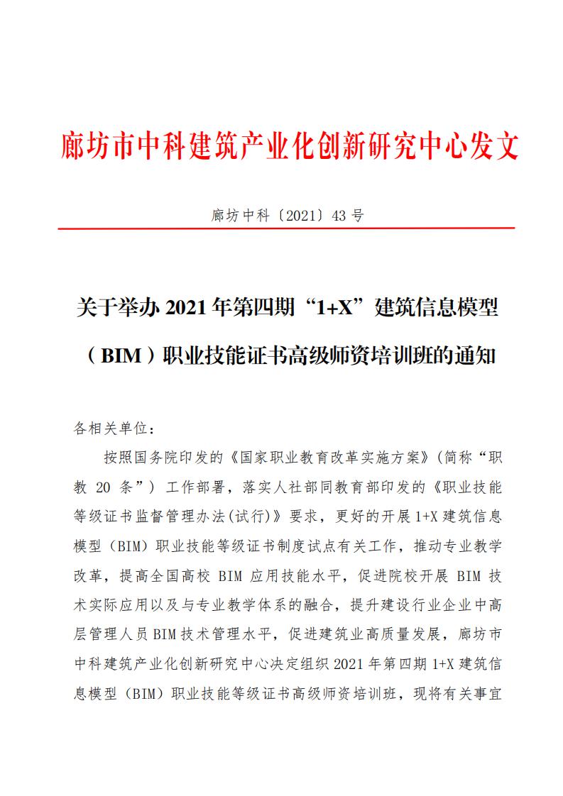 廊坊中科[2021]043号-关于举办2021年第四期“1+X”建筑信息模型(BIM)职业技能证书高级师资培训班的通知.pdf