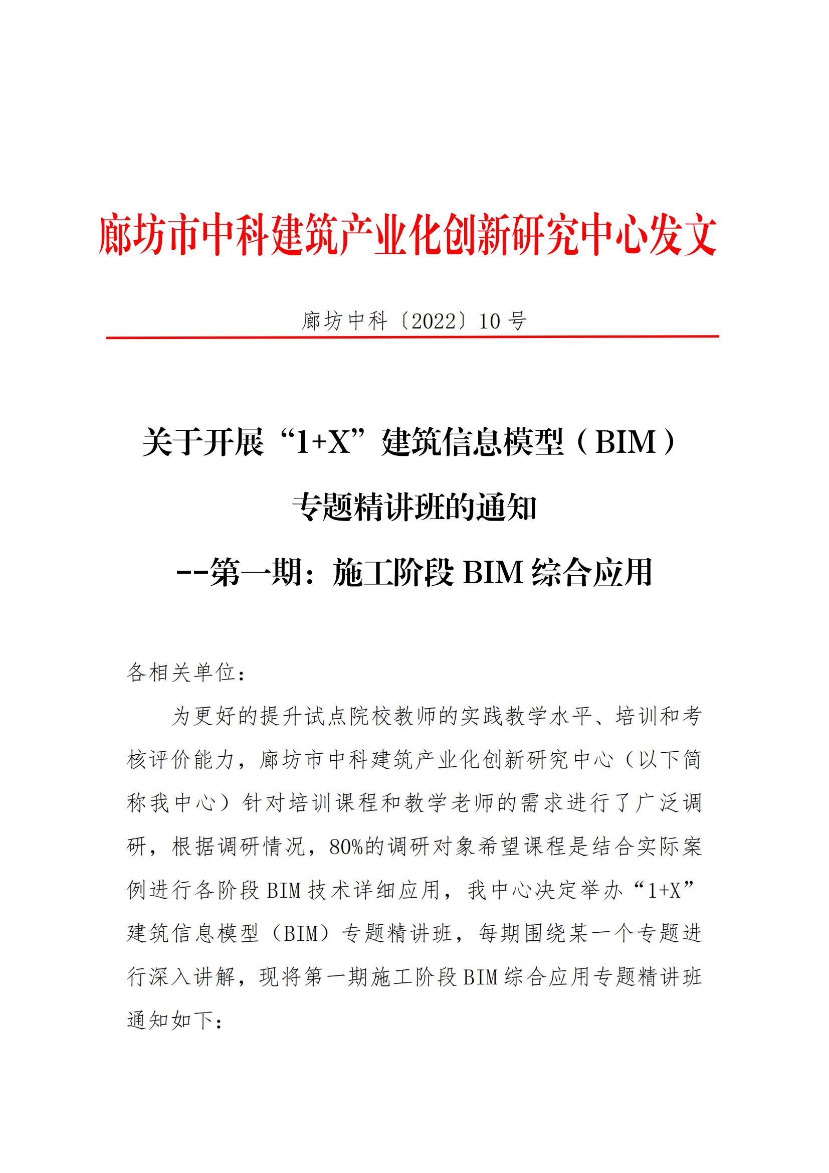 廊坊中科[2022]010号-关于开展“1+X”建筑信息模型(BIM)专题精讲班的通知--第一期:施工阶段BIM综合应用.pdf