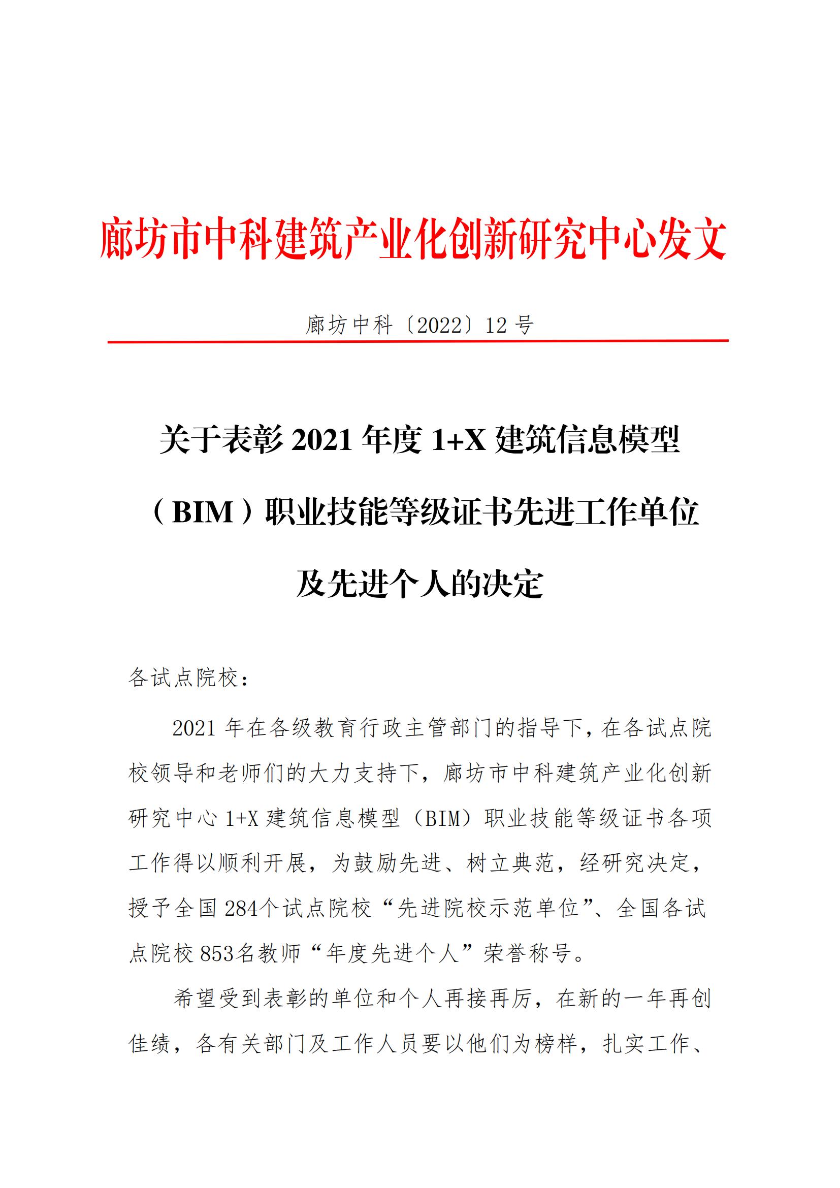 关于表彰 2021 年度 1+X 建筑信息模型 (BIM)职业技能等级证书先进工作单位 及先进个人的决定