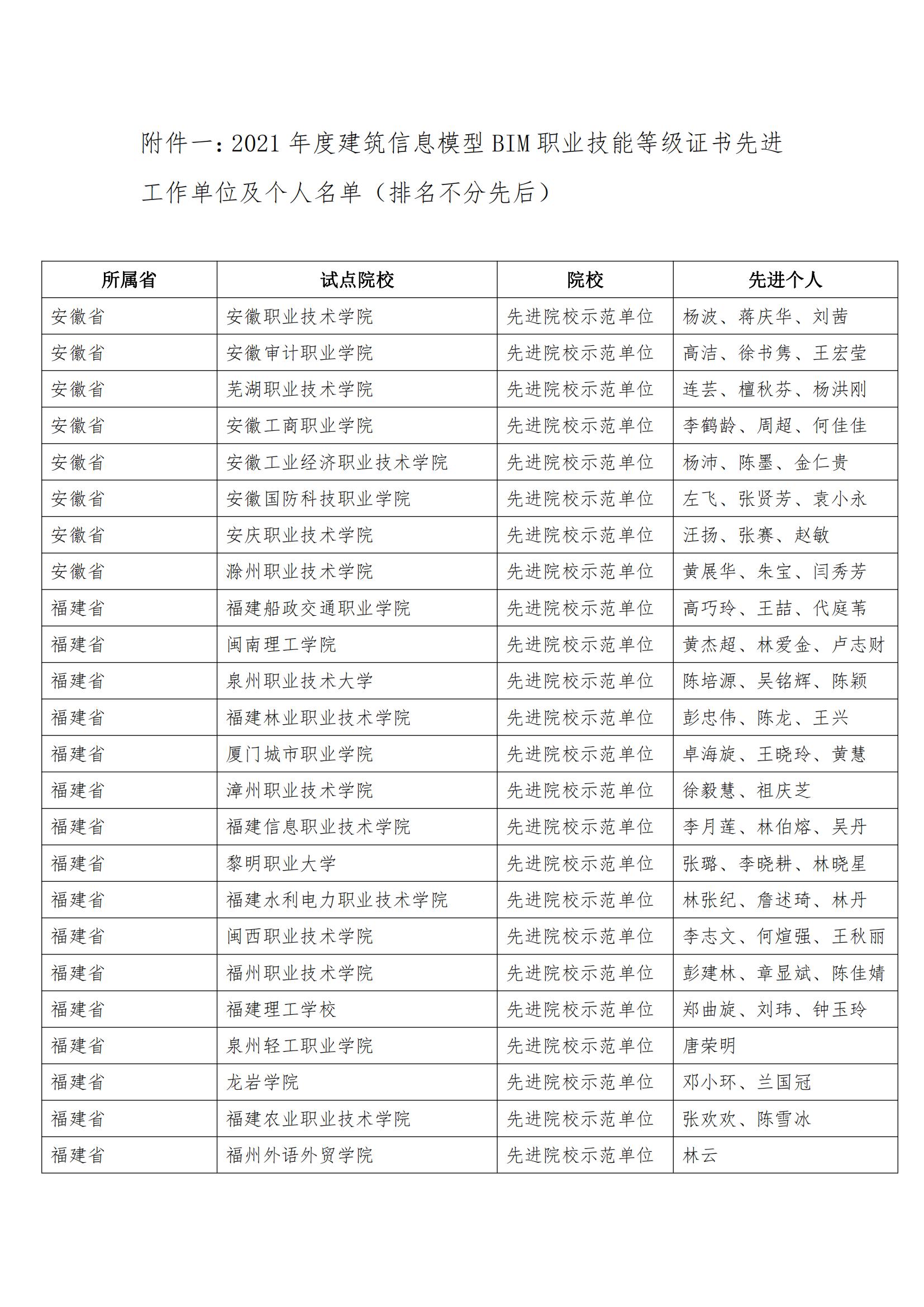 附件:关于表彰 2021 年度 1+X 建筑信息模型 (BIM)职业技能等级证书先进工作单位 及先进个人的决定
