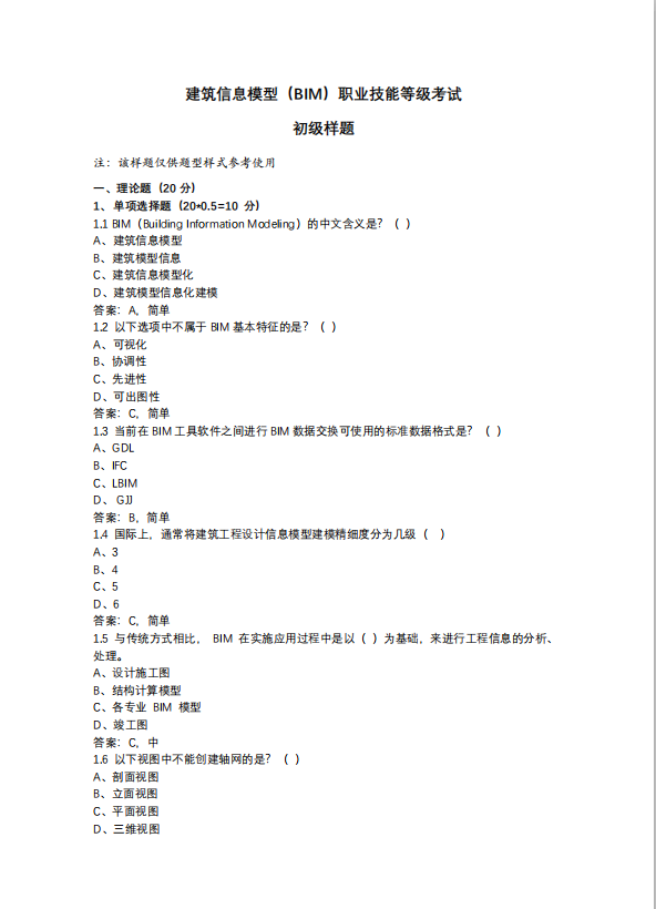 建筑信息模型(BIM)职业技能等级证书初级样题公布,图片形式仅有前三页,欲获取全部完整样题请点击下方链接。